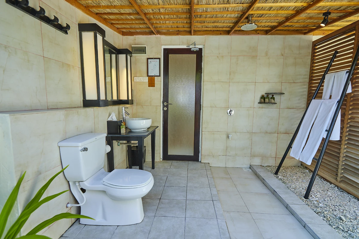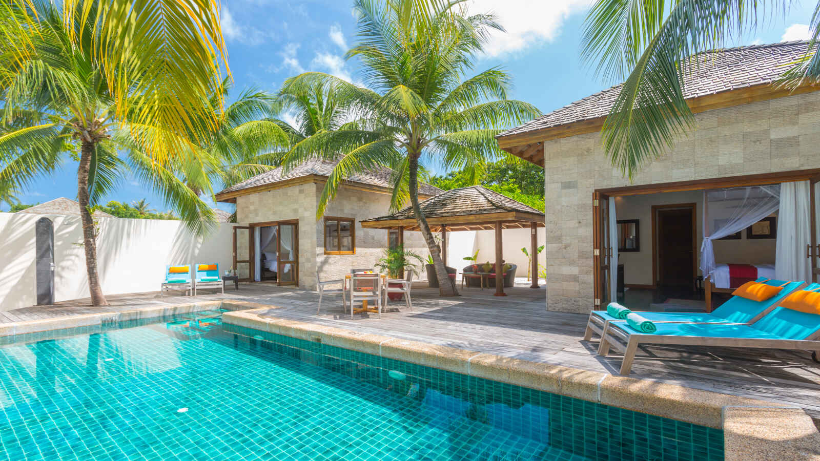 Ces bungalows de 54 m² simples et confortables peuvent accueillir 3 adultes ou 2 adultes et 1 enfant. Ils sont situés dans la partie nord de l’île, dans un cadre très paisible car un peu à l’écart des parties communes de l’hôtel mais avec un accès direct à la plage. Chaque chambre est ornée de tons vifs et de sols carrelés qui apportent de la fraîcheur. La chambre ouverte comprenant un lit king-size à baldaquin avec une moustiquaire, un coin bureau/boudoir ainsi que deux fauteuils accompagnés d’une table basse. L’arrière-cour abrite une salle d’eau semi-ouverte équipée d’une douche, d’un WC et d’une vasque. La terrasse extérieure est aménagée avec un coin repos et deux lits de plage individuels. Chaque villa dispose de l’air conditionné, d’un ventilateur de plafond, d’une machine à café espresso, d’un minibar, d’une barre de son et d’un coffre-fort.