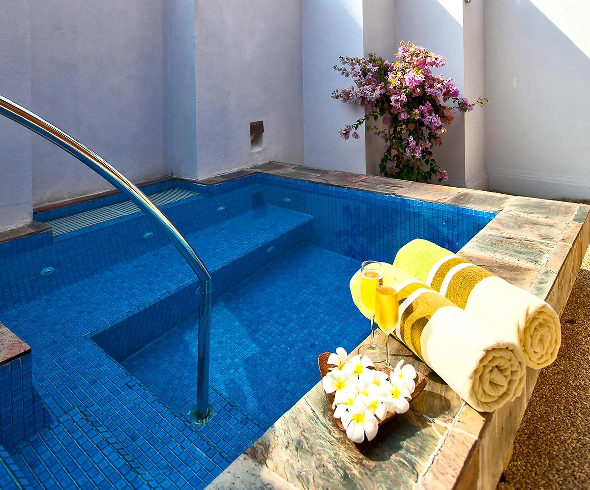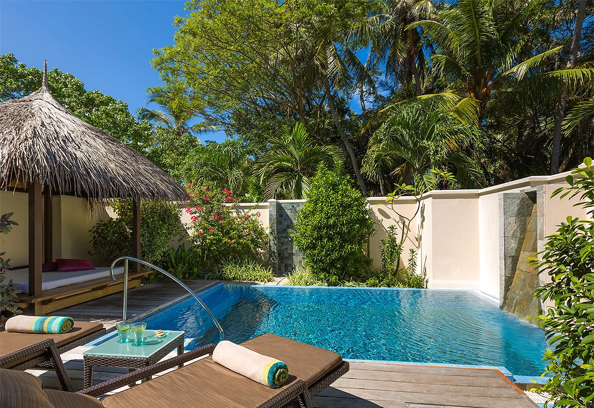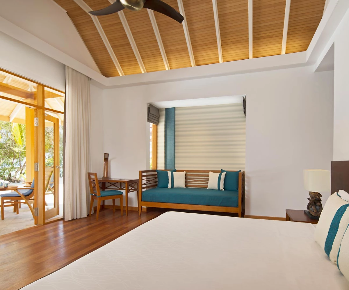Ces villas spacieuses de 103 m² s’étirent le long de la plage, entourées d’une végétation tropicale luxuriante et peuvent accueillir jusqu’à 4 personnes (dont 3 adultes). Chacune offre un accès direct à la mer depuis une terrasse aménagée, conçue pour un style de vie intérieur-extérieur. L’orientation des villas leur confère une position privilégiée aux premières loges pour assister au lever du soleil sur l’océan Indien. Durant l’après-midi, les cocotiers pourvoient un treillis d’ombrage appréciable. Une discrète cour arrière abrite un grand bain à remous. La salle de bains attenante est équipée d’une baignoire îlot, de doubles vasques, de toilettes et d’une cabine de douche classique. L’espace de vie se divise en deux parties distinctes : le salon, comprenant un canapé d’angle et une télévision et la chambre avec un lit king-size. Un grand dressing interconnecte l’espace de vie et la deuxième terrasse avec la salle de bains. Chaque villa est équipée d’une cafetière à piston, de café fraîchement moulu de la marque Lavazza, d’une machine à café Nespresso, de deux téléviseurs à écran plat et d’adaptateurs électriques.