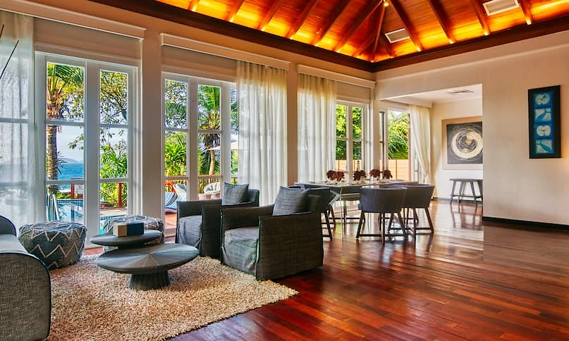 Votre hôtel particulier à Silhouette face à l’océan Indien et avec service de majordome et accès privé à la plage ! Cette demeure de maître de 1 200 m² peut accueillir 4 adultes et 4 enfants vous donne accès à tous les superlatifs. Majordome dédié au bon déroulement et à la personnalisation ultime de votre séjour, vues panoramiques sur la plage et l’océan Indien dès le réveil et depuis presque toutes les pièces de la villa, 2 suites parentales avec leur terrasse et salle de bains hors norme, grand salon de réception avec une PlayStation® pour toute la famille, immense piscine à débordement ceint d’une grande terrasse et d’un belvédère sous toit de chaume doté d’un espace dînatoire perché au-dessus de la mer, accès privé à la plage… Cette résidence idéale pour les familles nombreuses et groupes d’amis permet de vivre un séjour en tous points exceptionnel et marqué du sceau de l’excellence, en communion avec l’exubérante et paradisiaque nature de Silhouette.