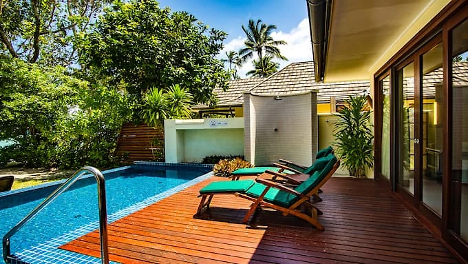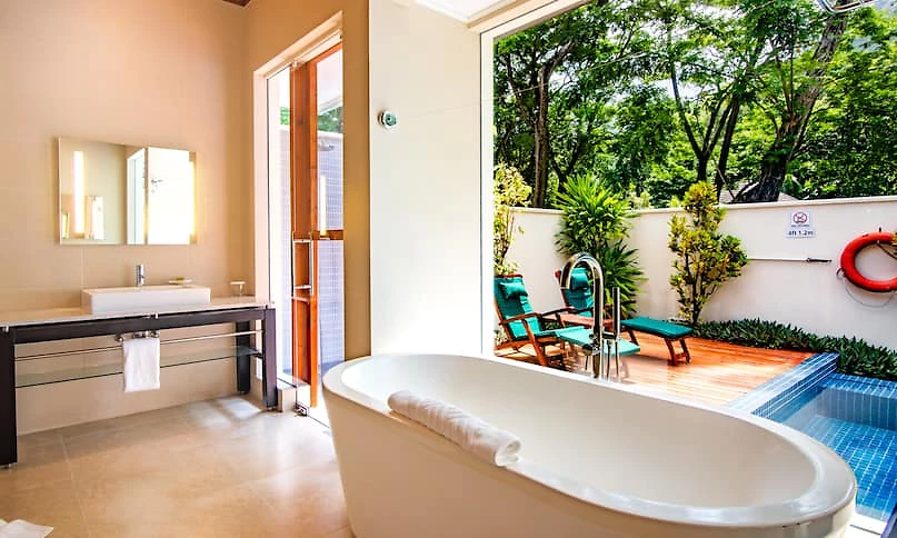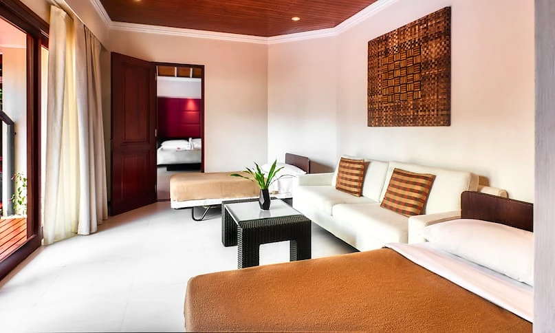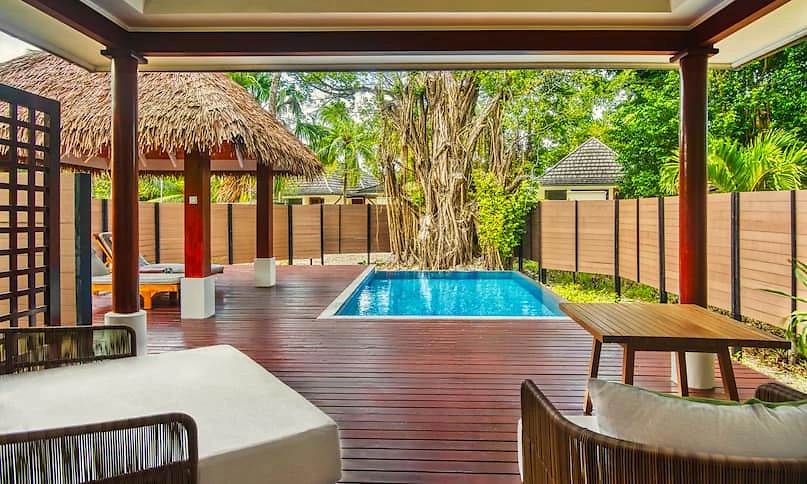 Cette charmante villa contemporaine de 88 m² peut accueillir 3 adultes ou 2 adultes et 2 enfants. Le couchage parental est en lit king-size très douillet agrémenté de linge de lit haut de gamme en coton 300 fils. Située en rez-de-jardin à quelques pas de la plage, elle est blottie au cœur des luxuriants jardins du domaine de l’hôtel. On pourra pleinement en apprécier la vue, bercé par la douce brise des hélices du ventilateur de plafond depuis le patio privatif sous la varangue, avec son salon d’extérieur en bois exotique et ses lits de plage attenants. L’intérieur dispose de beaux volumes sous plafonds mansardés de bois exotique et est décoré avec sens de l’épure et chic contemporain. L’espace est au rendez-vous avec un vrai bureau, une circulation très feng shui autour du lit qui structure la pièce principale et un espace dédié au dressing. Les tonalités du bois naturel font écho aux couleurs apaisantes aux teintes crème des sols et des murs. Une grande baie vitrée du sol au plafond qui donne sur la terrasse accentue la sensation de volume et de respiration. La spacieuse salle de bains comporte une baignoire-îlot, une double vasque et s’ouvre sur une coquette cour intérieure avec douche extérieure à effet de pluie. Ce magnifique cocon permet de vivre en communion avec l’exubérante nature environnante.