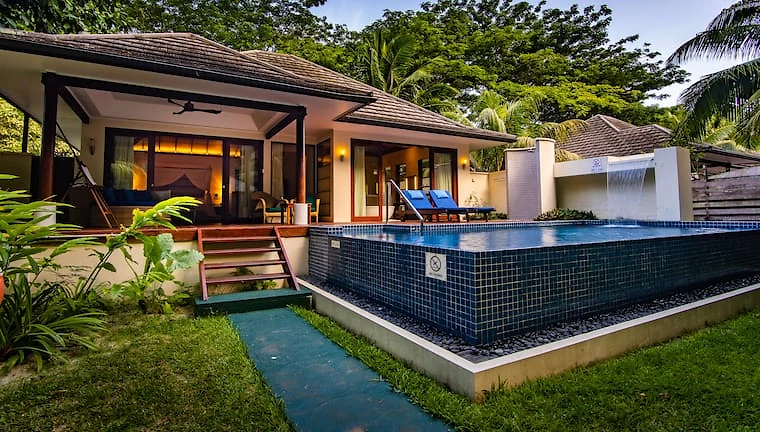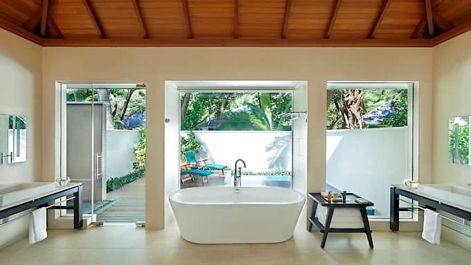 Posée et toute intimité dans la forêt tropicale, cette vaste villa contemporaine de 185 m² est idéale pour les familles. Elle peut accueillir 3 adultes ou 2 adultes et 2 enfants. Le couchage parental est en lit king-size très douillet agrémenté de linge de lit haut de gamme en coton 300 fils. Nichée dans les luxuriants jardins du domaine de l’hôtel, cette résidence est la promesse d’une robinsonnade inoubliable. Elle dispose de son propre jardin clos intérieur avec une grande piscine à débordement dans laquelle l’eau tombe comme d’une cascade. Tout l’espace de circulation est recouvert d’un parquet en bois exotique. Un grand belvédère fait du même bois et couvert de chaume permet de bénéficier d’un délicieux ombrage aux heures chaudes de la journée. Avec son salon d’extérieur et espace dînatoire ou ses lits de plage attenants, on y laissera aisément filer les heures insouciantes. L’intérieur dispose de beaux volumes sous plafonds mansardés de bois exotique et est décoré avec sens de l’épure et chic contemporain. L’espace est au rendez-vous avec un vrai bureau, une circulation très feng shui autour du lit qui structure la pièce principale, un espace dédié au dressing, un grand coin salon avec canapés, TV et table basse et de nombreux rangements. Les tonalités du bois naturel font écho aux couleurs apaisantes aux teintes crème des sols et des murs. Les grandes baies vitrée du sol au plafond qui donnent sur la terrasse accentuent la sensation de volume et de respiration. La spacieuse salle de bains comporte une baignoire-îlot, une double vasque et s’ouvre elle aussi sur la terrasse. Cette magnifique résidence permet de vivre un séjour mémorable en communion avec l’exubérante nature de Silhouette.
