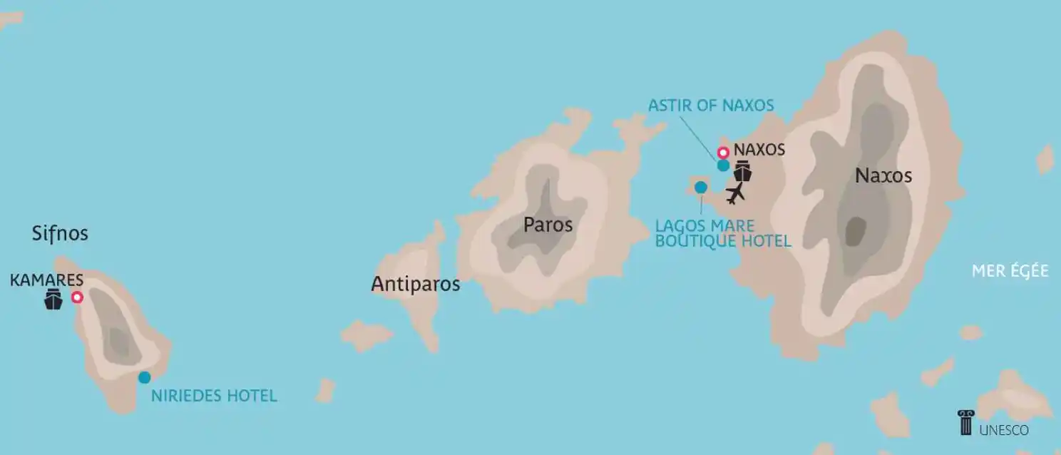 Situé dans le cadre idyllique du village d’Agios Prokopios à seulement 5 min à pied d’une magnifique plage de sable fin et 5 km de Naxos, ce charmant hôtel-boutique est idéal pour un séjour à la découverte de l’île.
