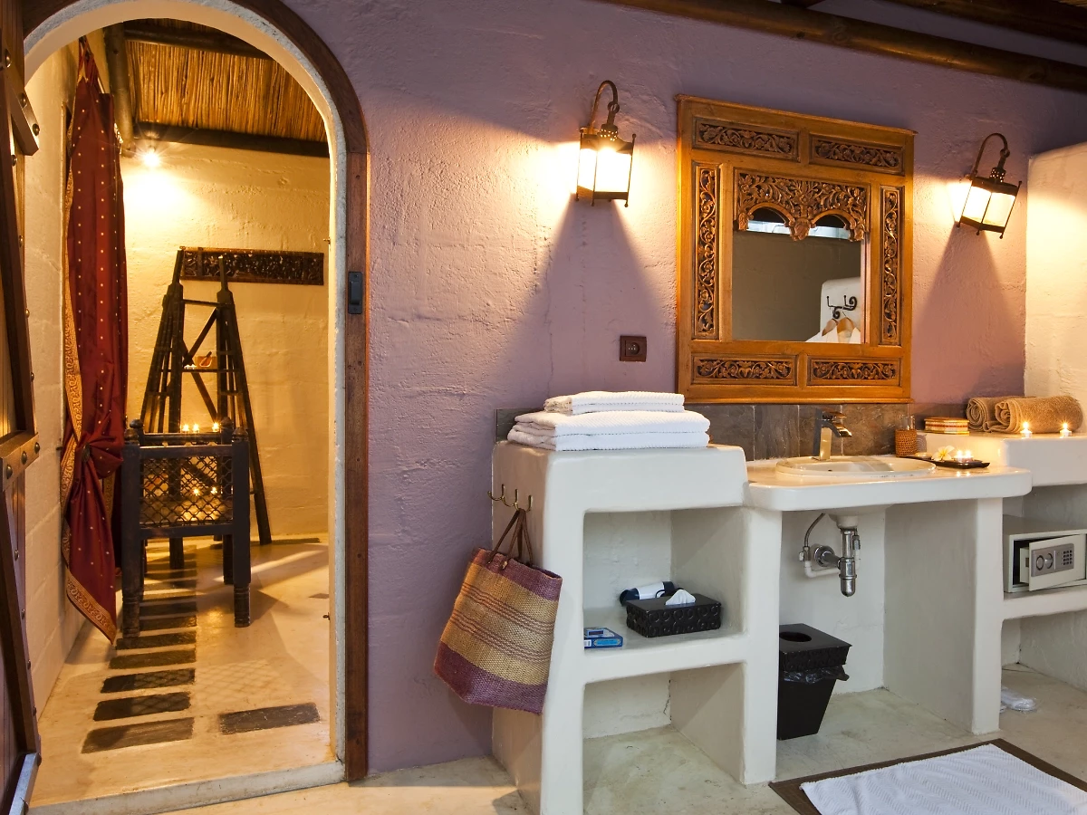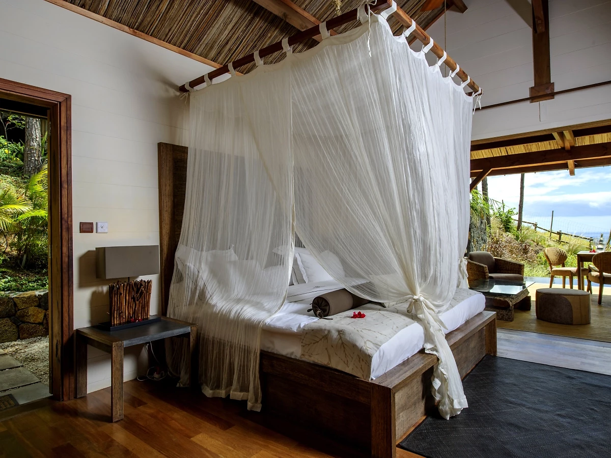Dans chaque suite, la chambre principale, spacieuse et élégante, est dotée d’un très grand lit double orné d’une moustiquaire et s’ouvre sur un coin salon confortable. La salle de bains à ciel ouvert, préservée des regards, est équipée d’une douche à effet pluie pour une expérience sensorielle unique en pleine nature, ainsi que d’une double vasque.