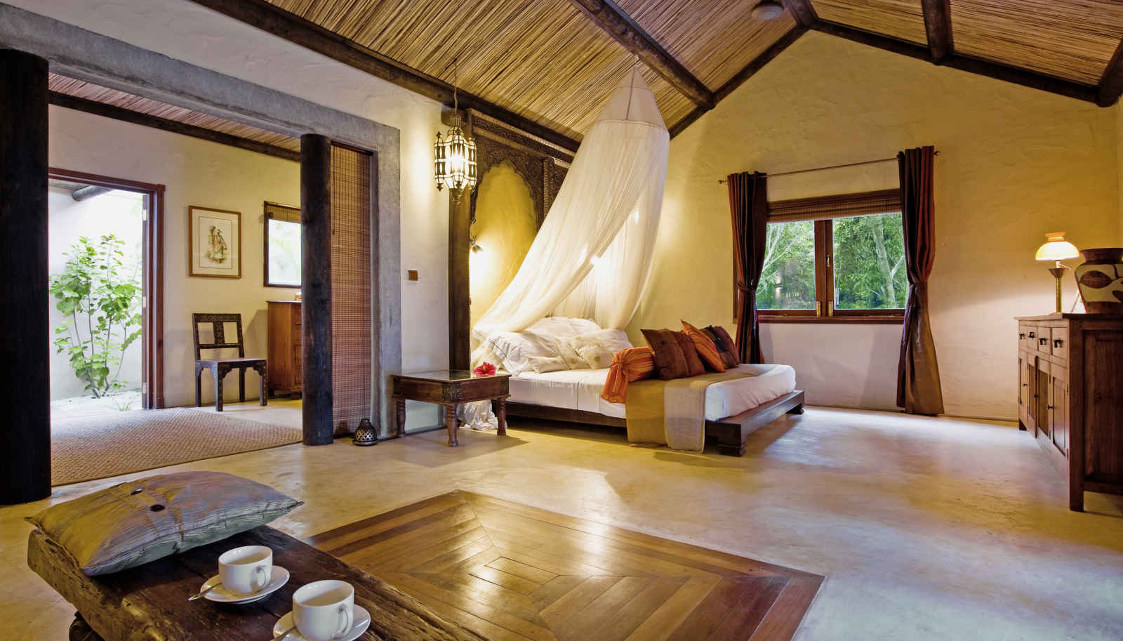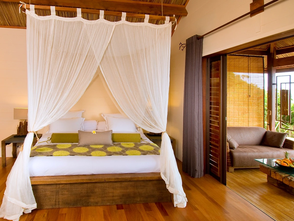 Dans chaque suite, la chambre principale, spacieuse et élégante, est dotée d’un très grand lit double orné d’une moustiquaire et s’ouvre sur un salon aménagé avec un canapé, une table basse et un fauteuil. Cet espace dispose également d’un bureau.