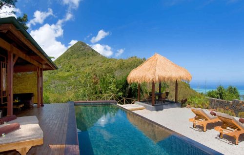 Leur belle hauteur sous plafond mansardé accentue la sensation d’espace et de luminosité. Chaque suite dispose d’une vaste terrasse mi-ombragée, aménagée avec un espace repas, des transats ainsi que d’un magnifique gazébo en bois tropical, véritable salon d’extérieur a un véritable salon extérieur avec canapé. Tout cet espace s’agence autour d’une piscine à débordement, nid d’aigle qui semble se fondre dans l’horizon grâce aux reflets de l’eau.