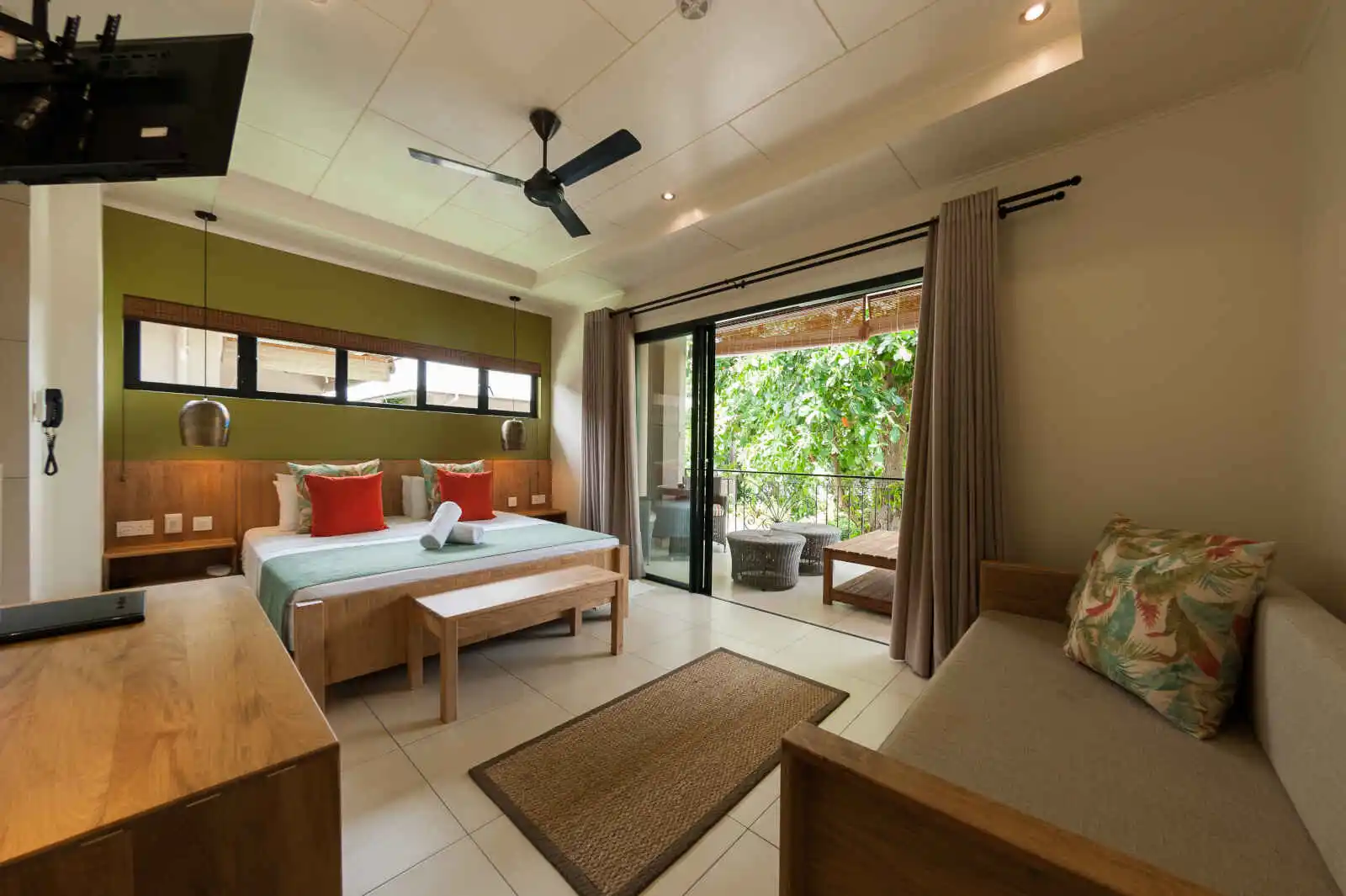 Cette chambre, d’une superficie de 32 m², bénéficie d’une situation très agréable en front de mer, offrant une belle vue sur l’océan Indien. Elle vous accueille dans un cadre chaleureux avec un style classique et des meubles en bois. Grâce aux baies vitrées donnant sur le balcon aménagé, elles sont baignées de lumière naturelle. Surplombant le jardin tropical du complexe, ces suites peuvent accueillir jusqu’à 3 personnes. Leur intérieur comprend une spacieuse chambre avec un lit king-size ou des lits jumeaux, un espace bureau et une salle d’eau équipée d’une douche. Le balcon est confortablement aménagé avec des meubles en rotin recouverts de coussins et une table basse. Des options supplémentaires telles que des lits d’appoint, des lits bébé et des chambres communicantes sont disponibles sous réserve de disponibilité.