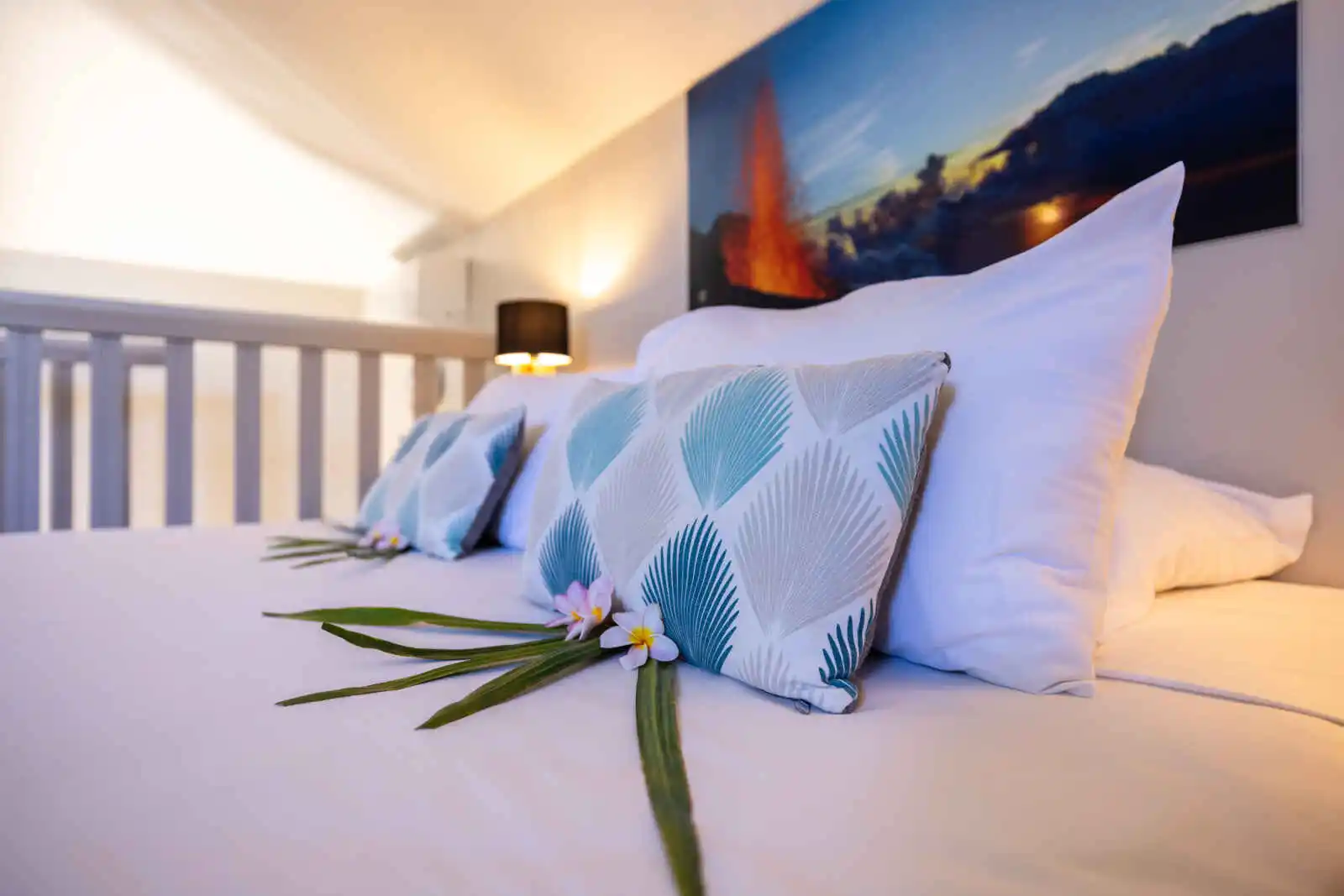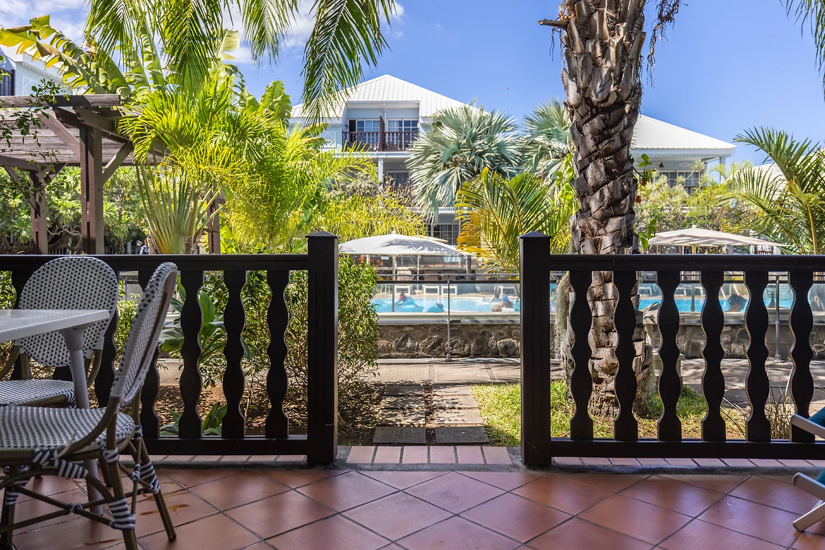 10 duplex de 51 m² (réunion d’un studio et d’une chambre standard) avec une varangue privative de 9 m² et un balcon de 4 m² pouvant accueillir 4 adultes et 1 enfant de -12 ans ou/et 1 bébé, vue piscine, 2 salles de douche, 1 grand lit + 2 lits individuels à l’étage.