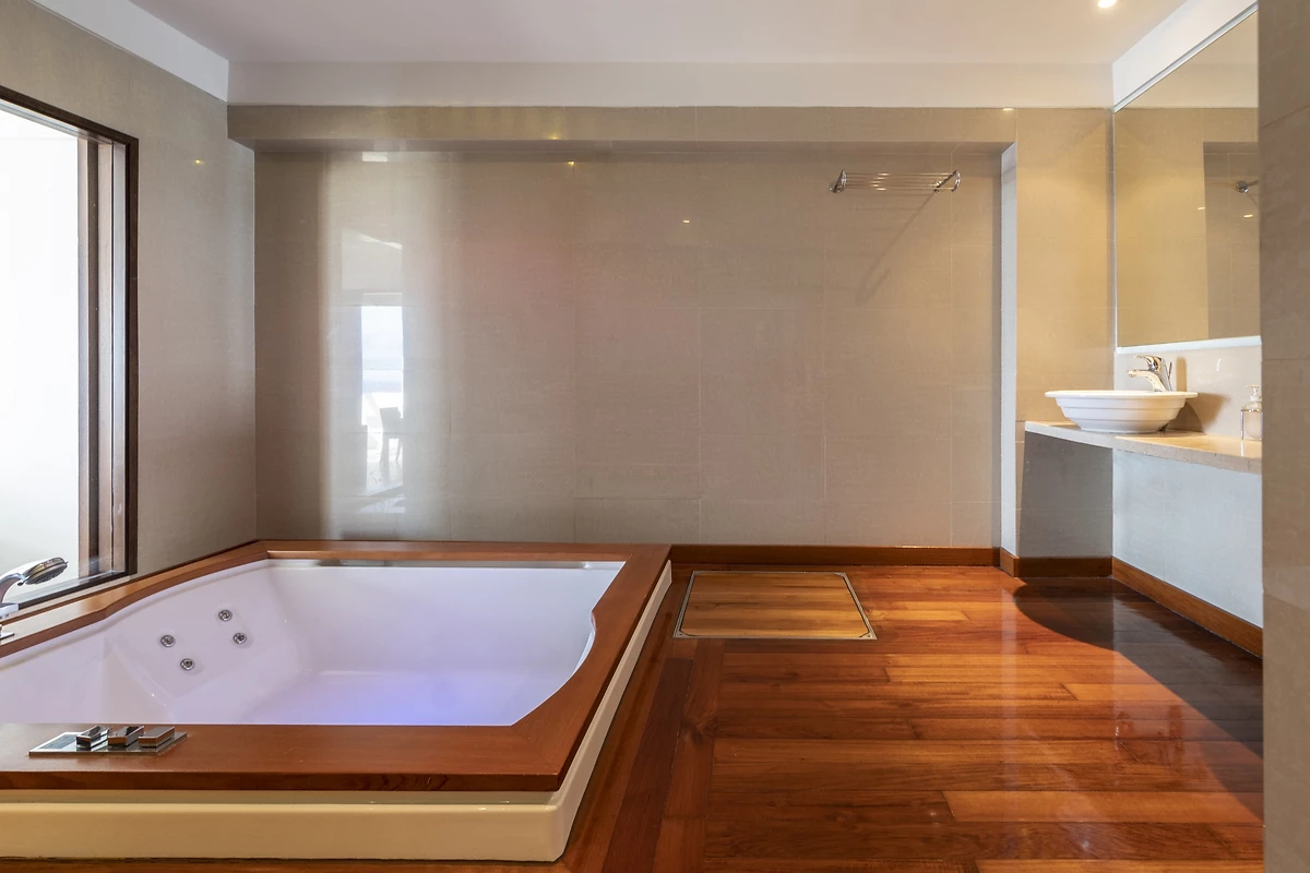 Suite 1 chambre vue mer, bain à remous (65 m², 2 adultes + 1 enfant de 2 à moins de 12 ans ou 3 adultes). Terrasse, télévision satellite, sèche-cheveux, coffre-fort, climatisation, salle de bains et douche, facilités thé/café, pantoufles et peignoir, WiFi.