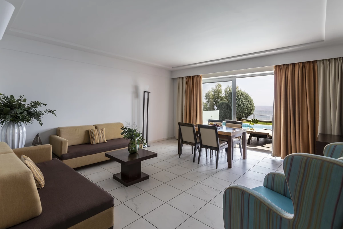 Suite 1 chambre vue mer, piscine privée (65 m², 2 adultes + 1 enfant de 2 à moins de 12 ans ou 3 adultes). Terrasse, télévision satellite, sèche-cheveux, coffre-fort, climatisation, salle de bains et douche, facilités thé/café, pantoufles et peignoir, WiFi.
