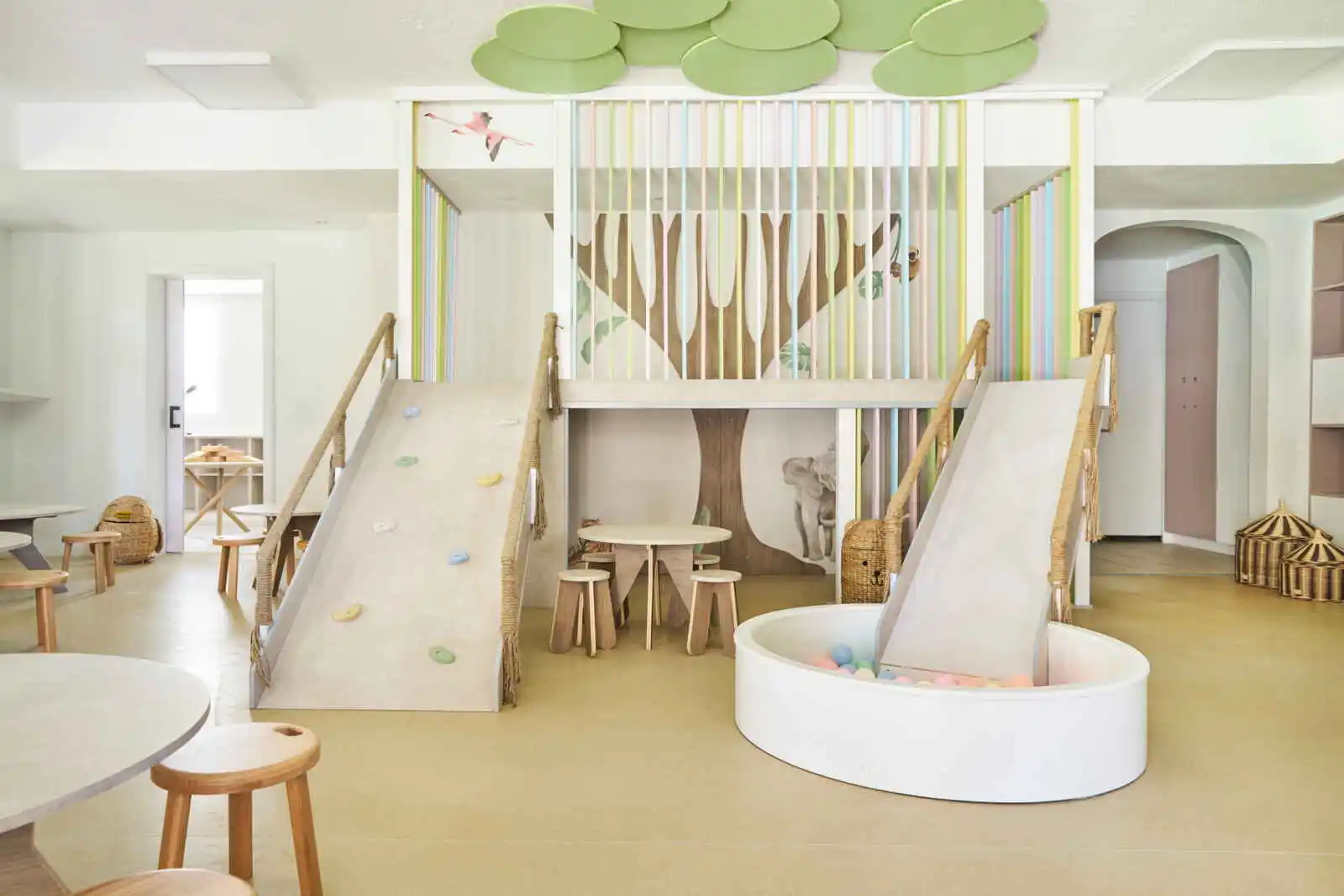 La chambre ouverte comprend un lit king-size au matelas Sleep Tight particulièrement confortable. Pièce maîtresse de la suite qui trône sur une petite estrade, elle s’ouvre sur un grand salon avec un canapé et fauteuil jaune citron rehaussé d’un tapis corail qui donne sur la grande terrasse. On y trouve également une table basse, un ventilateur de plafond et un coin bar avec un élégant chariot à cocktails. Vous pourrez y préparer vos libations avant d’aller les déguster dans votre espace cabane privé en extérieur. Pour votre divertissement, des films à la demande sont disponibles, accompagnés de ports USB pour le chargement de vos appareils. Les grandes baies vitrées, du sol au plafond, inondent la pièce de lumière naturelle, créant une atmosphère lumineuse et apaisante.