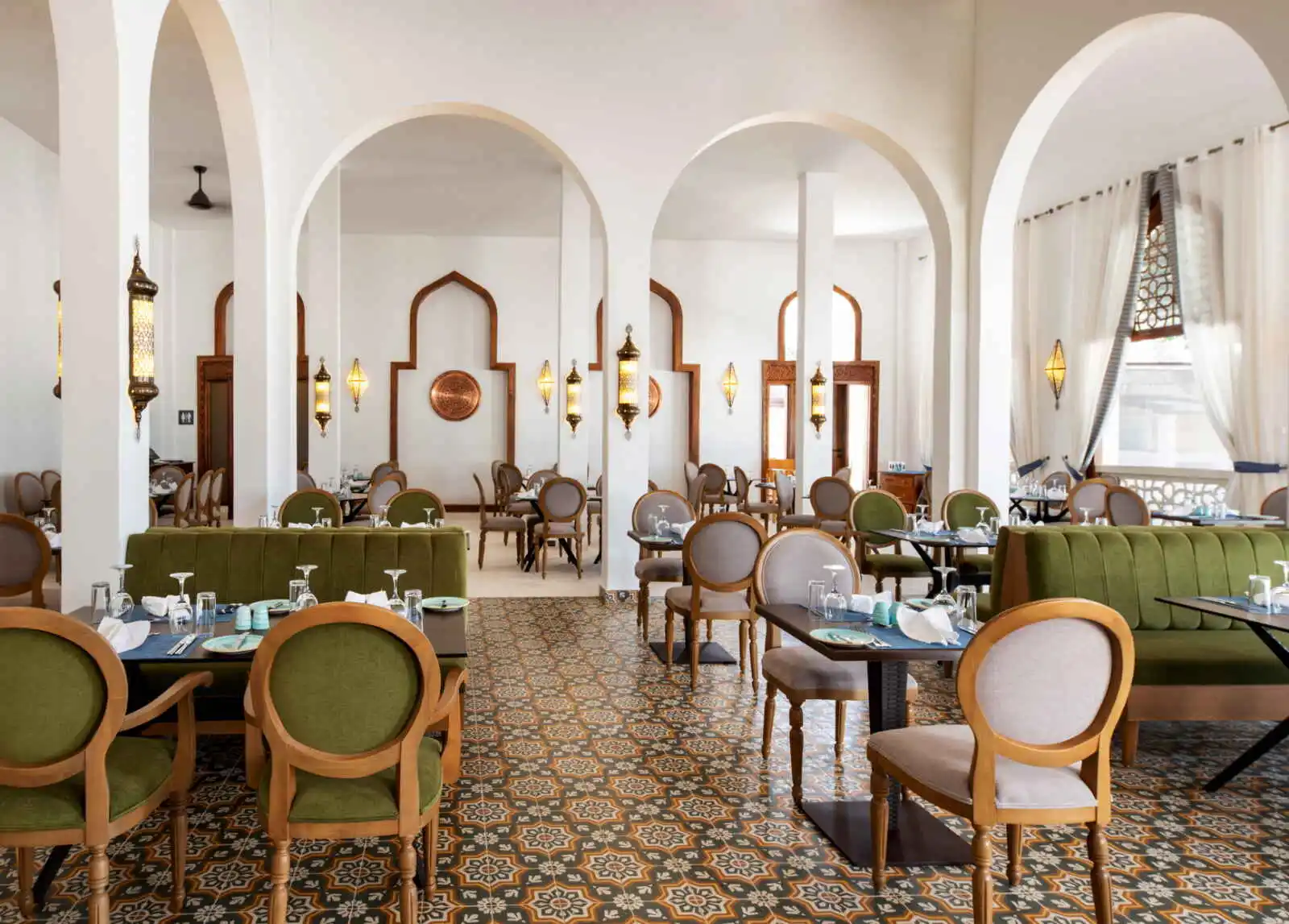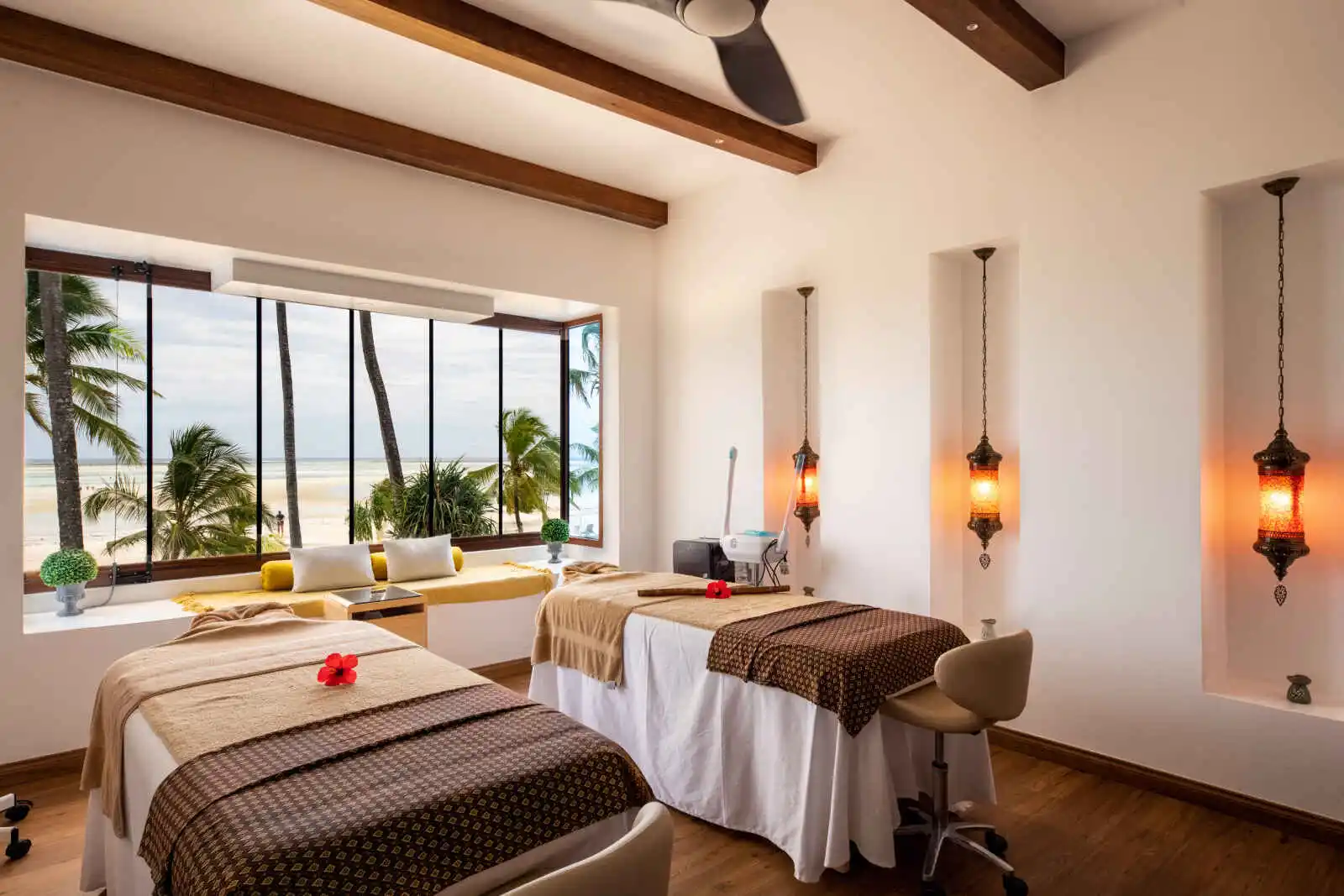 À l’intérieur, les matériaux soigneusement sélectionnés, tels que le laiton et le bois durable, apportent une touche naturelle et délicatement authentique. Ils créent un cadre à la fois moderne et en harmonie avec l’environnement tropical comme avec l’histoire de « l’île aux épices ». Grâce aux grandes baies vitrées du sol au plafond, les espaces de vie sont inondés de lumière naturelle. Chaque chambre est équipée d’un lit king-size ou de lits jumeaux et dispose d’une salle d’eau élégante aux lignes orientalisantes, avec double vasque, wc séparés et une douche italienne à effet de pluie particulièrement appréciable après une journée sous le soleil de Zanzibar.