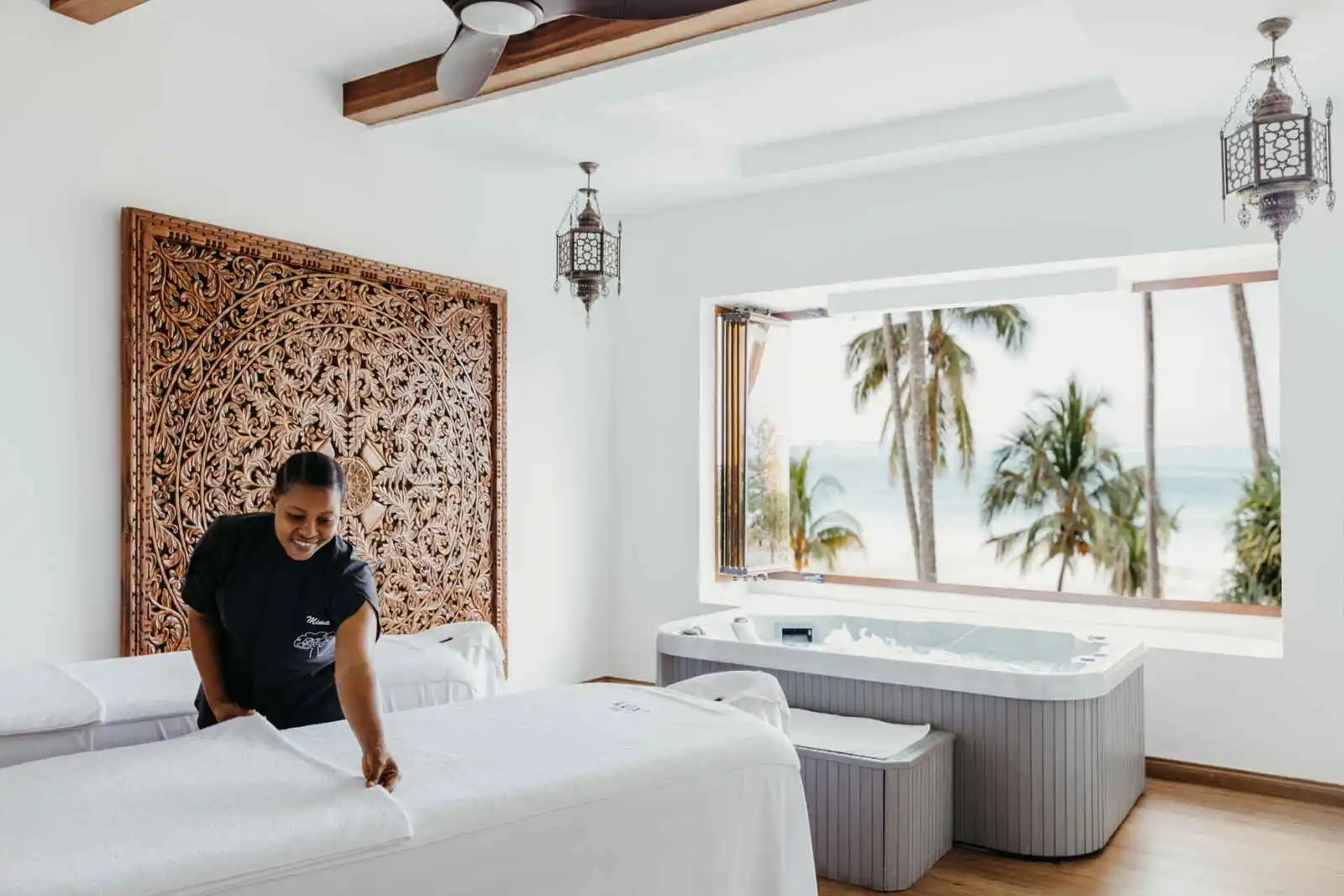 Les matériaux soigneusement sélectionnés, tels que le laiton et le bois durable, apportent une touche naturelle et délicatement authentique. Ils créent un cadre à la fois moderne et en harmonie avec l’environnement tropical comme avec l’histoire de « l’île aux épices ». Chaque chambre est équipée d’un lit king-size ou de lits jumeaux et dispose d’une salle d’eau élégante aux lignes orientalisantes, avec wc séparés et une douche italienne à effet de pluie particulièrement appréciable après une journée sous le soleil de Zanzibar.