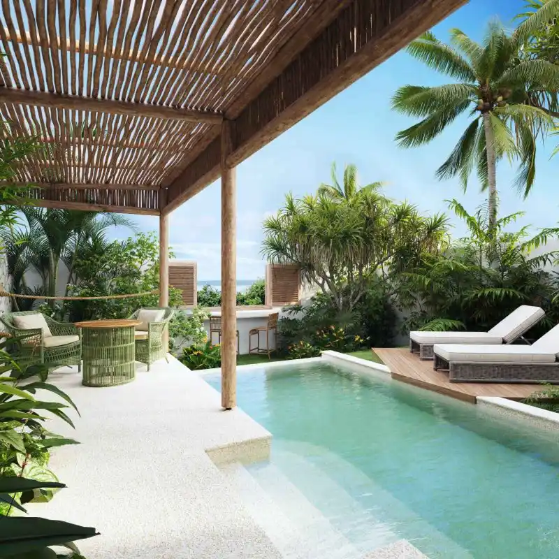 (101 m2) située face au lagon, avec piscine privée et un emplacement de plage réservé avec une paillote et deux transats.