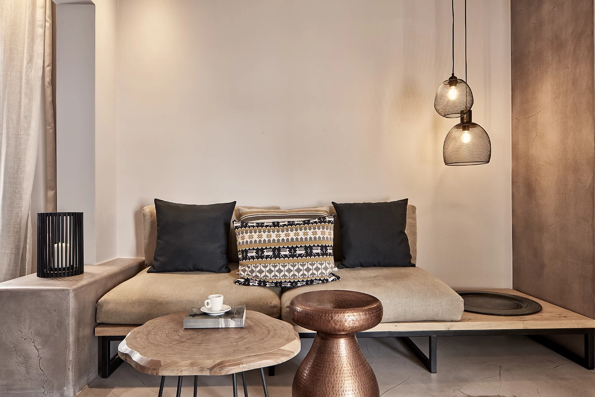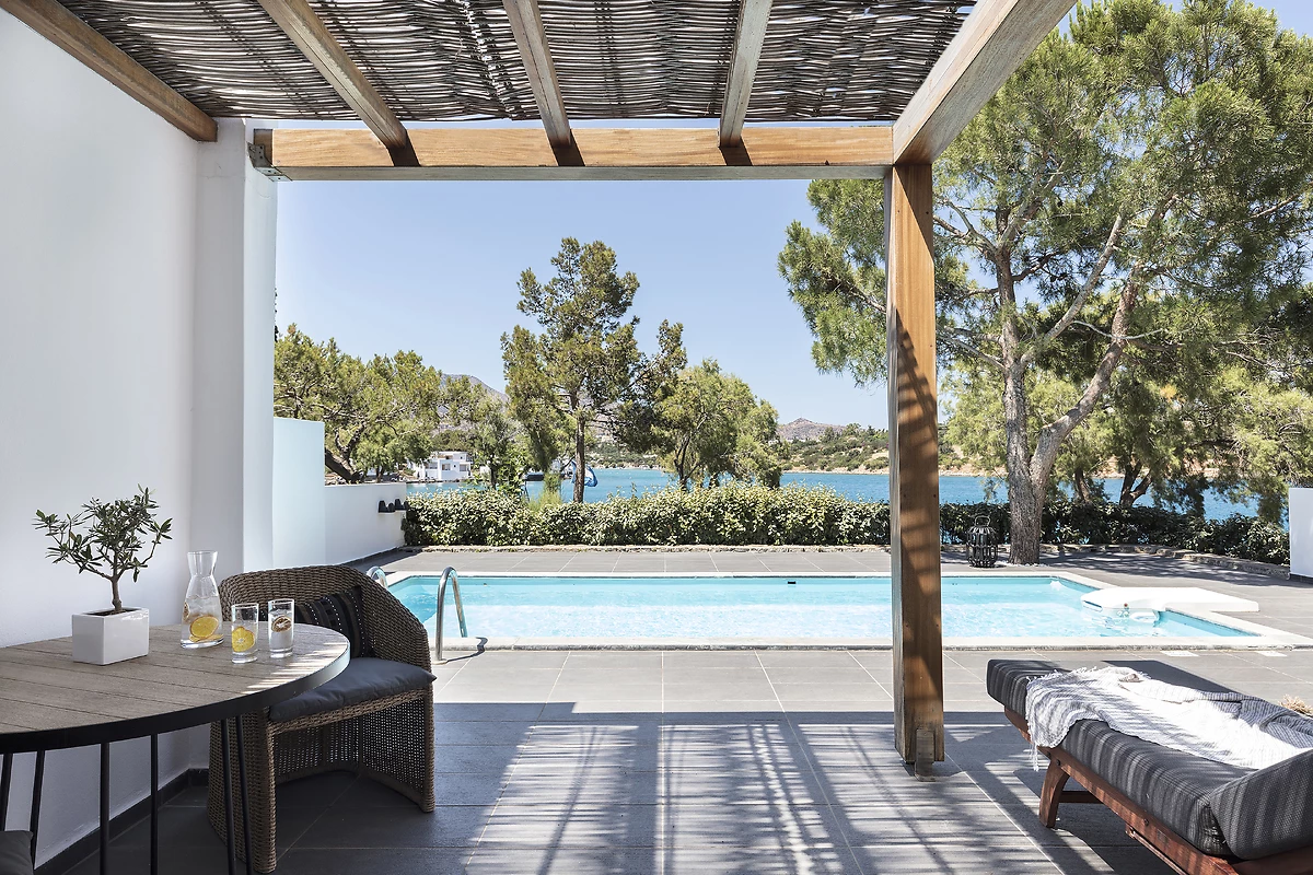 D’une superficie de 26 m² et niché au deuxième rang dans les beaux jardins de l’établissement, ce superbe bungalow peut accueillir deux personnes. Très élégant, dans un style bohème chic avec des tons terre, il s’ouvre sur une terrasse avec vue sue la baie de Mirabello et la mer. Un choix idéal pour les couples.