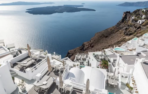 L’emplacement de cet hôtel justifie à lui seul le voyage. Conçues dans le plus pur design cycladique, baignées de lumière et d’un blanc immaculé, les chambres de l’hôtel sont comme agrippées à la roche de Santorin. Toutes offrent des vues extatiques sur sa mythique caldeira qu’on pourra passer des heures infinies à contempler. Cela tombe bien, toutes les chambres offrent de larges balcons ou des terrasses où vous lézarderez avec délectation. On the Rocks appartient à la chaîne Small Luxury Hotels of the World. Vous êtes au paradis sur terre : à l’hôtel On the Rocks à Imerovigli, Santorin. Profitez du coucher de soleil avec un verre de vin des vignes de Santorin, dégustez des plats créés par le chef pour créer des explosions de joie dans votre palais, détendez-vous sur les chaises longues sur votre terrasse et les coussins de la piscine, laissez votre regard se promener dans la mer Égée, touchez la main de votre autre moitié et gardez ce que vous ressentez en vous pour toujours.