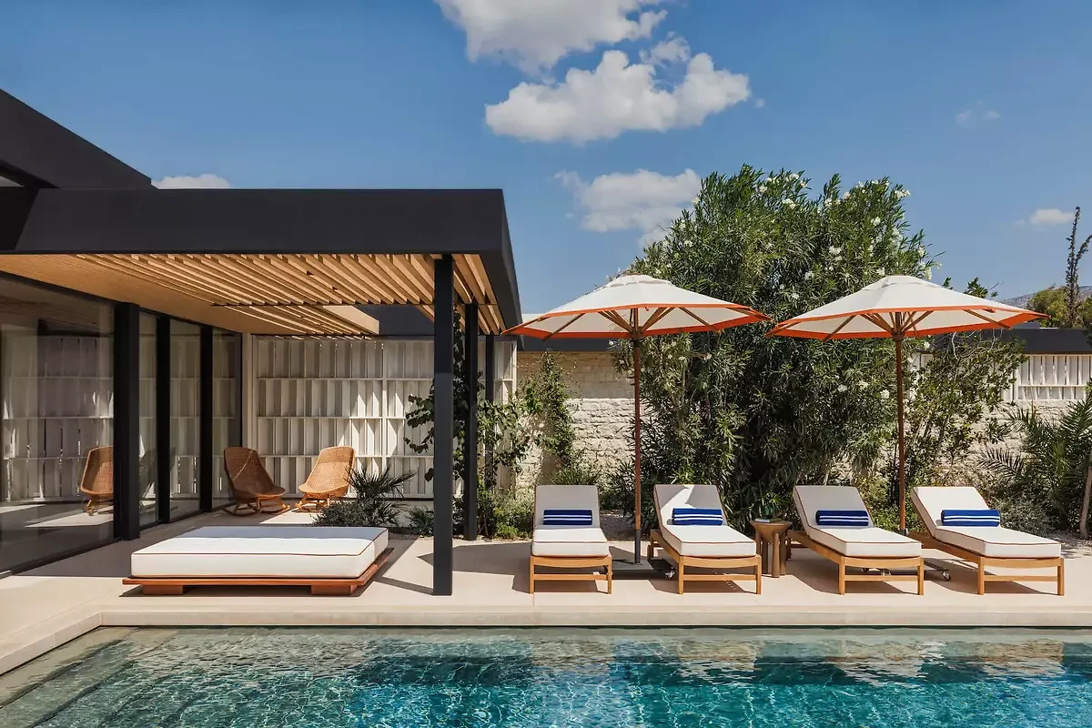 Agrémenté d’une flore aux effluves méditerranéennes, les jardins des bungalows offrent de nombreuses possibilités de se détendre et de se relaxer à l’extérieur. La piscine privée est entourée d’un lit bain de soleil et des transats, pour des journées décontractées dans la brise égéenne. Un deuxième espace de jardin est équipé d’une douche extérieure et d’un brasero, où vous pourrez vous blottir au clair de lune. À l’intérieur, plongez dans votre baignoire en pierre et admirez les jardins, ou bien faites coulisser les portes en verre pour relier les intérieurs mid-century à l’extérieur de façon transparente.