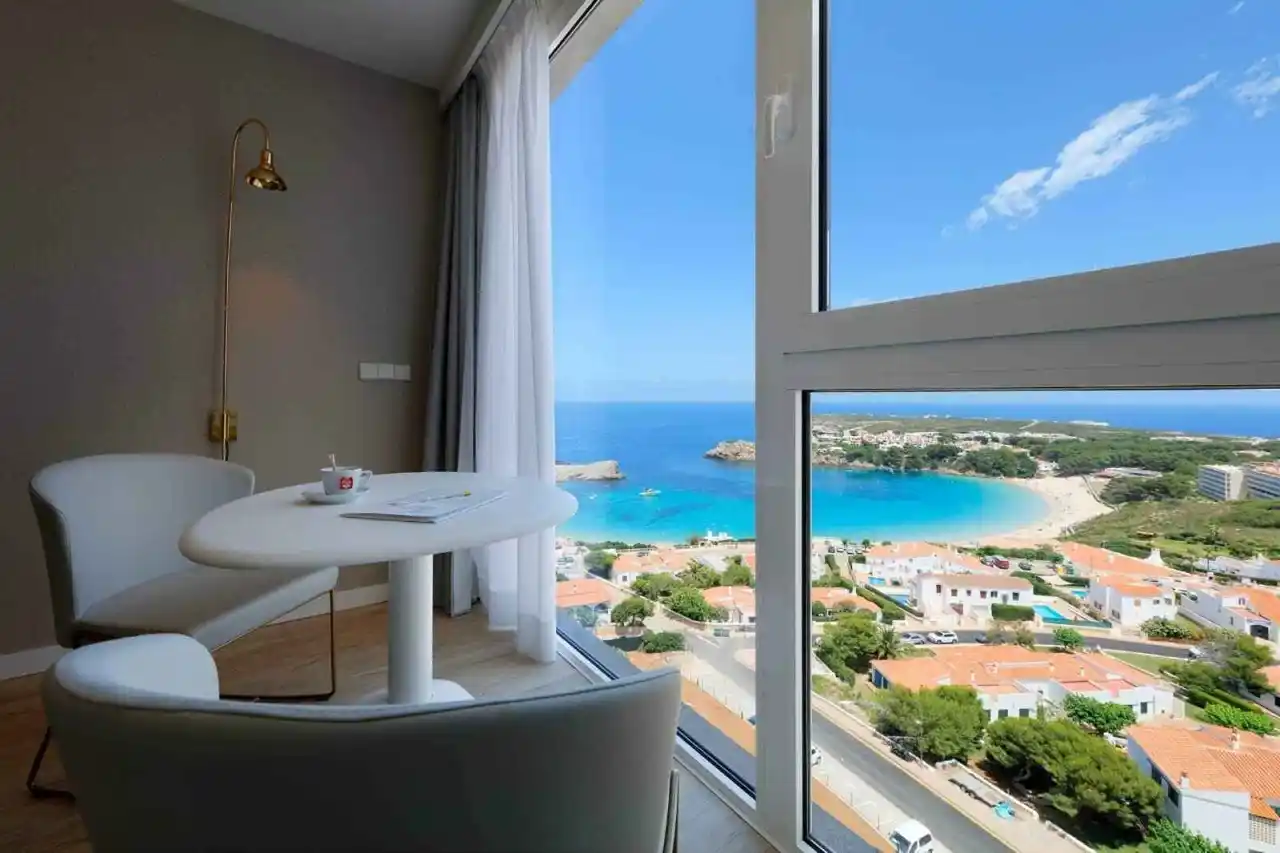 Chambre lumineuse de 23 m² située aux deux derniers étages de l’hôtel, avec balcon meublé offrant une vue imprenable sur la pittoresque baie d’Arenal d’en Castell.
