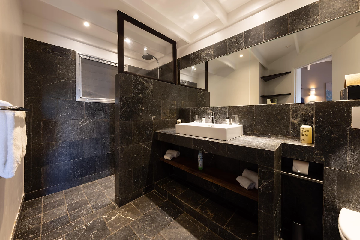 2 chambres de 30 m², pouvant accueillir jusqu’à 3 adultes, situées au 1er étage avec terrasse privée qui offre des vues spectaculaires sur la plage de sable blanc et une salle de bains moderne avec douche à l’italienne.