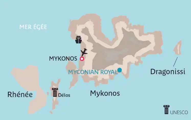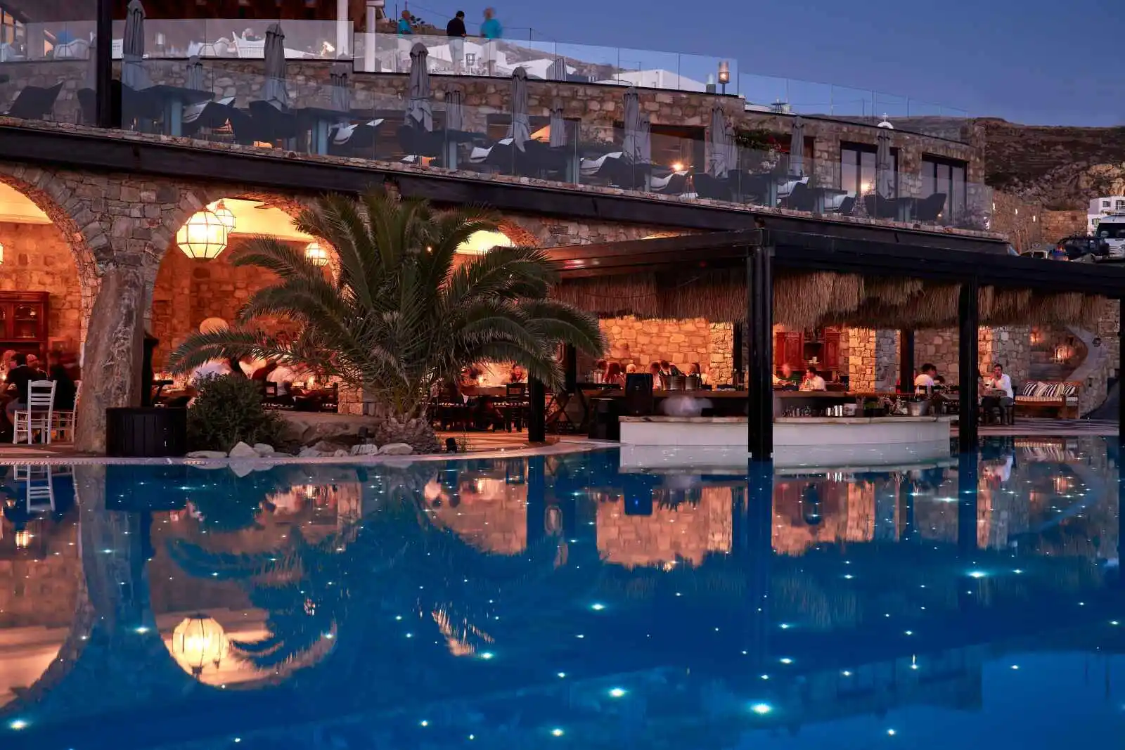 Membre des Leading hotels of the World, le Royal Myconian allie élégance et modernité dans un cadre d’exception. Derrière sa façade en pierre cycladique illuminée, l’hôtel dévoile des intérieurs contemporains et de vastes terrasses conçues par un décorateur grec renommé, mêlant influences antiques et touches modernes. Les chambres et suites, véritables havres de paix, offrent des vues imprenables sur la mer Égée depuis leurs balcons ou terrasses privés. Le spa de l'hôtel propose une gamme de soins revitalisants, parfaits pour se ressourcer après une journée ensoleillée.
