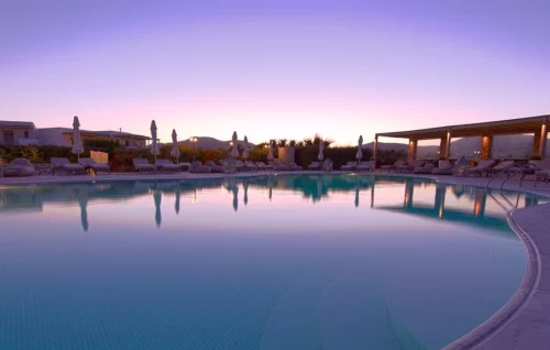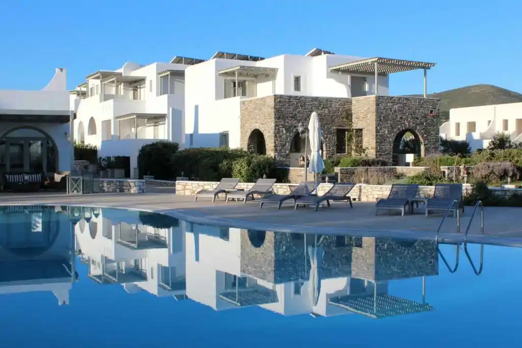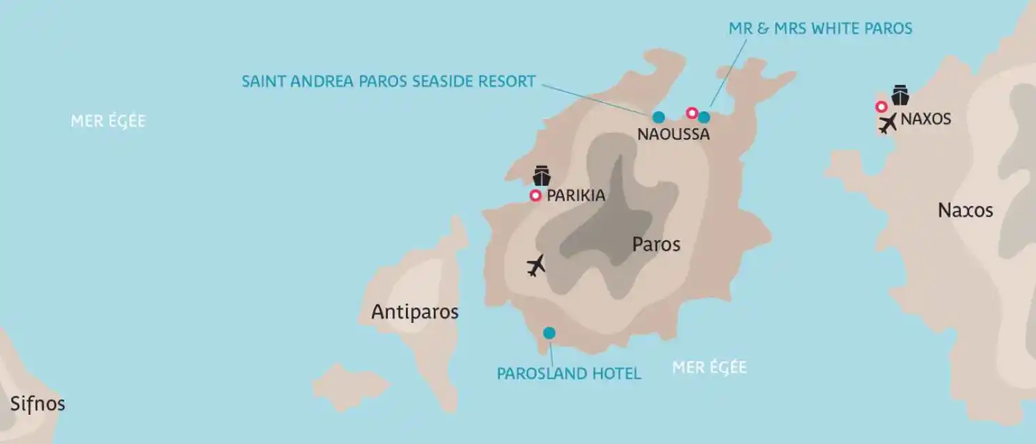 À 10 min du village et de son joli port de pêche et à proximité de la plage de Kolympithres, l’hôtel, construit face au golf de Naoussa, offre une vue panoramique sur la mer Égée et le relief avoisinant.