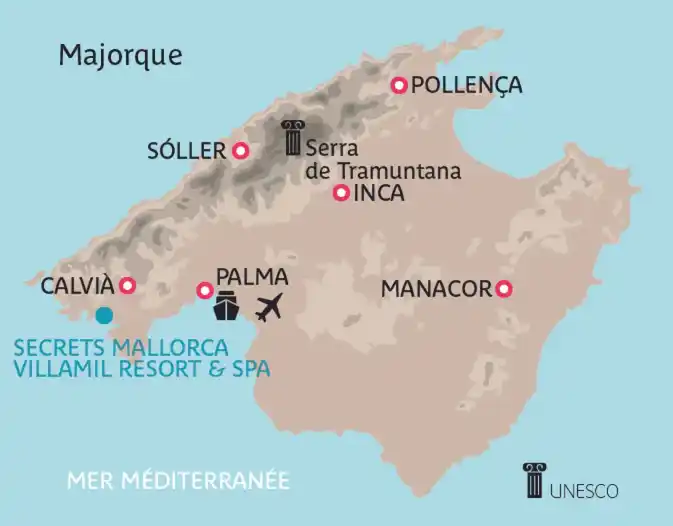 Situé à 27 km de l’aéroport de Palma de Majorque, à l’ouest de l’île.