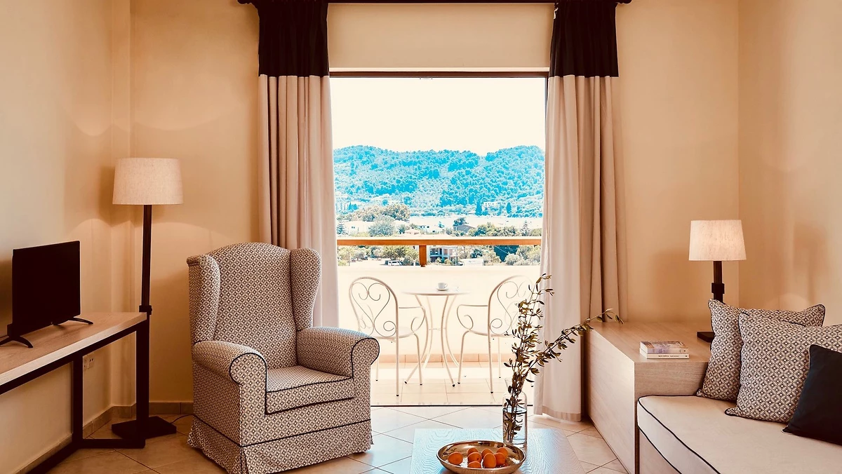 Suite deluxe (43 à 57 m², 2 adultes) séjour avec sofa et vue mer