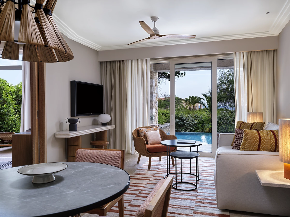 D’une superficie de 70 m², cette suite Infinity peut accueillir jusqu’à 2 adultes et 3 enfants. Elle possède un salon meublé avec goût, séparé de la chambre, avec un canapé-lit, un bureau et un coin salle à manger, qui s’ouvre sur une terrasse meublée et une très jolie petite piscine à débordement privée avec vue mer. La chambre dispose d’un lit king-size et d’une salle de bain avec baignoire et douche séparées.