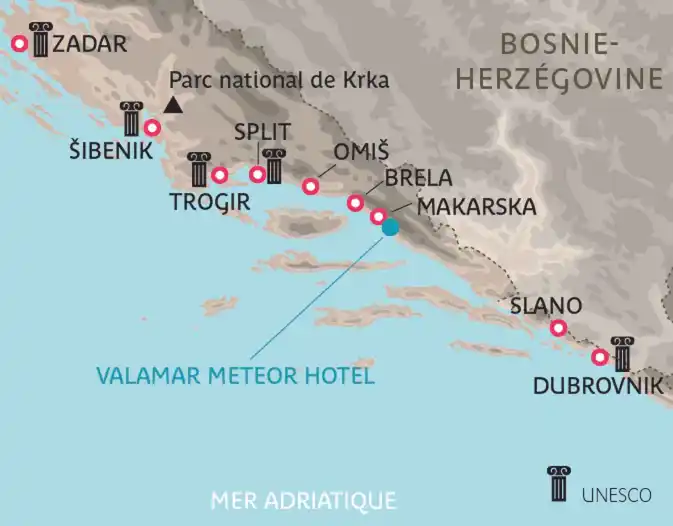 Près du centre-ville de la station balnéaire de Makarska, face à l’île de Brač. À une centaine de kilomètres à l’est de l’aéroport de Split.